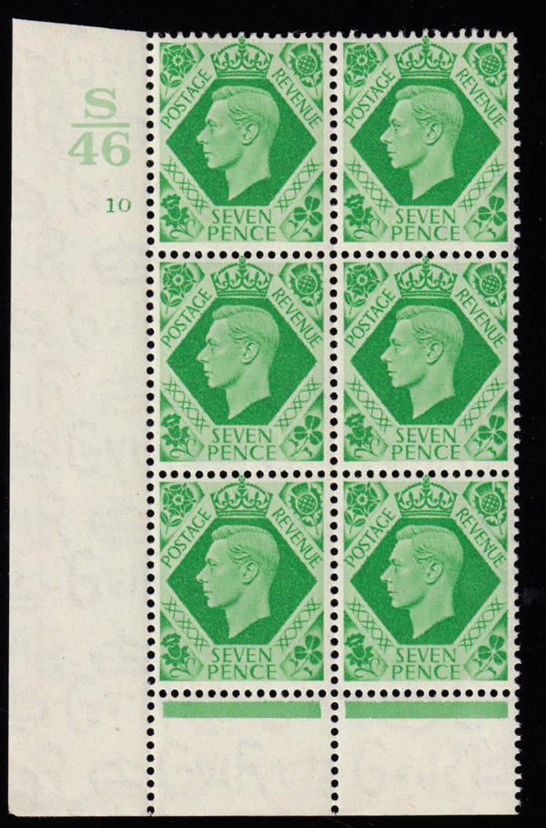 SG471 1939 7d. Emerald green, “damaged N in REVENUE”, R20/ 3, in unmounted cylinder 10 block of 6.