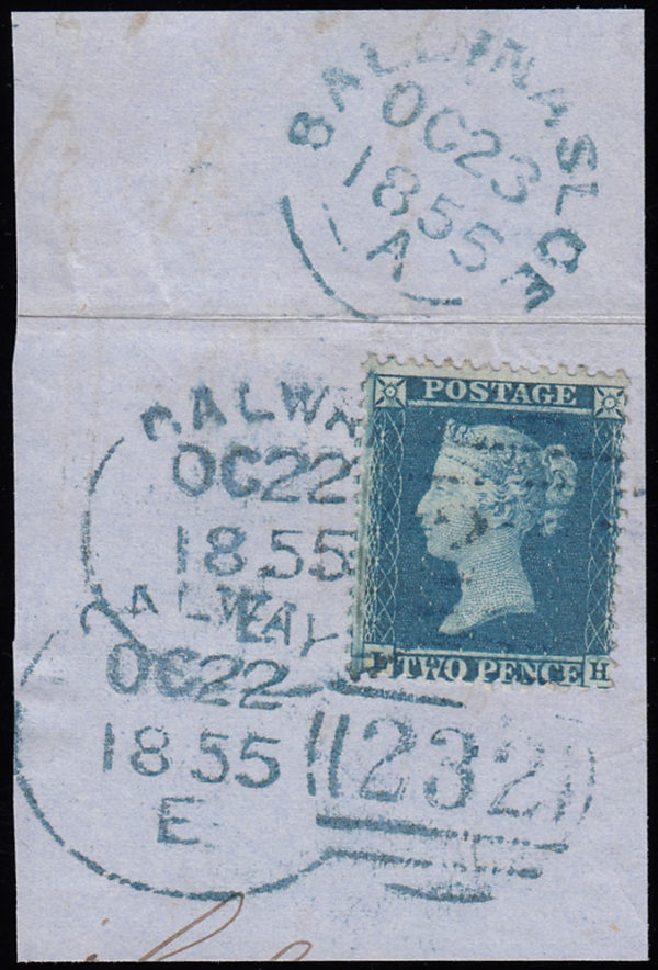 SG34 1855 2d. Blue, plate 5, LH. Superb used on piece, doubly cancelled by blue Galway Spoons.