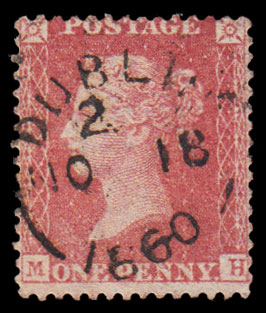 SG40 1857 1d. Rose-red Pl.48 (MH). Superb used cancelled by an excellent strike of the DUBLIN c.d.s. for NO. 18. 1860.