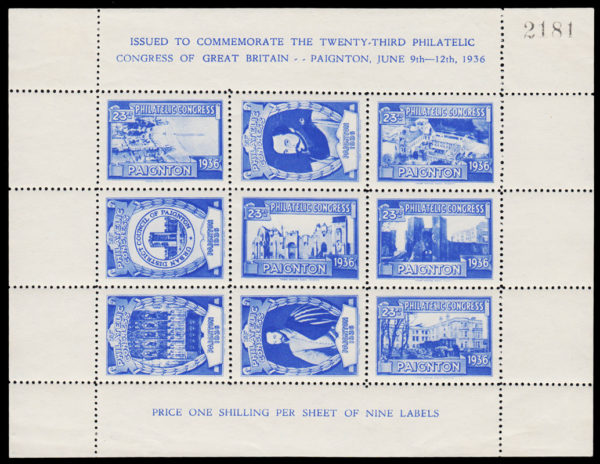 1936 “23rd PHILATELIC CONGRESS OF GT BRITAIN – PAIGNTON”. Unmounted o.g. (mounted in margin) sheetlet of nine different labels relating to Paignton.