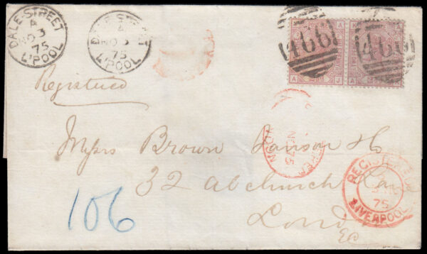 SG138 1875 2 1/2d. Rosy Mauve, plate 2 on blued paper, AJ-AK pair on Registered cover.