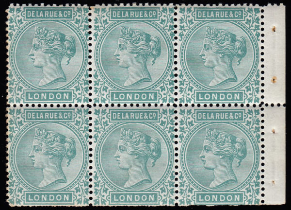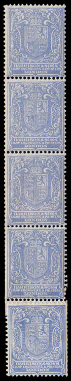 c.1911 Harrison & Sons Coil Join Trial. Royal Coat of Arms printed in dull blue. Vertical strip of five… the bottom pair joined. Very scarce.
