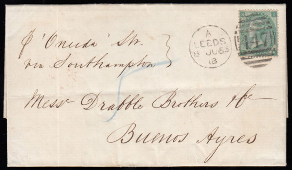 SG101 1865 1/- Green, plate 4, IK, watermark emblems, on entire, LEEDS to BUENOS AYRES.