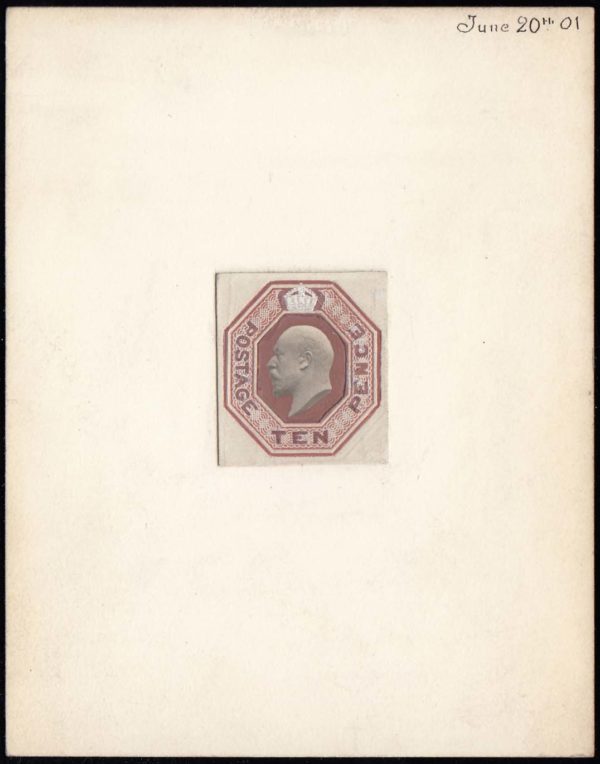 1901 10d. Stationery stamp, paste up essay with an embossed frame in brown and white.