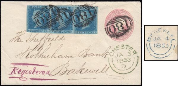 SG14 1853 1d. Pink envelope, uprated with strip of 3 2d’s NI-NK paying the registration of 6d.