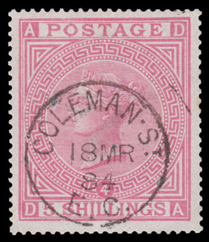 SG120 1867 2/- Pale blue, RH. Fine used with cds, plus a “zig-zag” errasure handstamp.