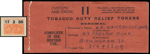 1958 Tobacco Duty Relief Tokens. “Customs and Excise” booklet with 32 x 2s.4d Orange stamps. Unusual and scarce.