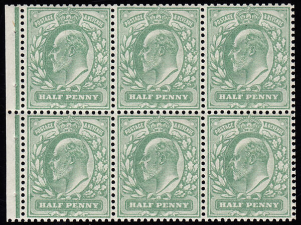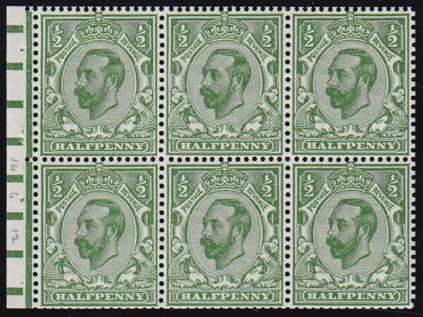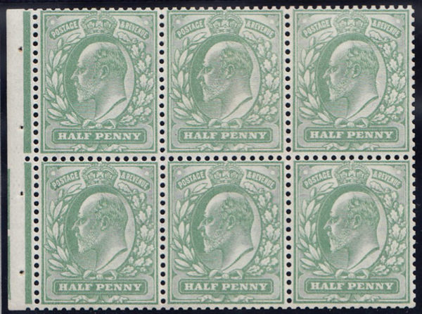 SG218cw 1902 ½d. Yellowish Green. D.L.R. Watermark Inverted. Booklet Pane of Six. Unmounted o.g. with very fine perfs. Cat. £375.