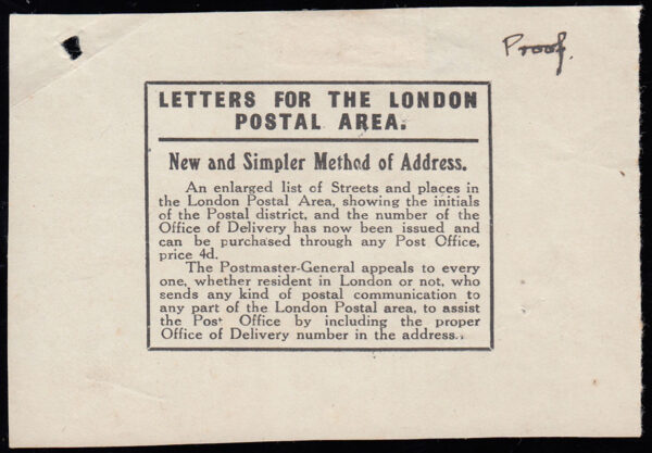 1925 Block Cypher booklet proof for interleaving. A fine P.O advert proof for “Letters for the London Postal Area”.