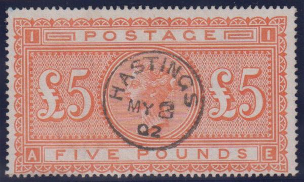 SG137 1882 £5 Orange/ white paper, AE, brilliant crisp cds of HASTINGS.