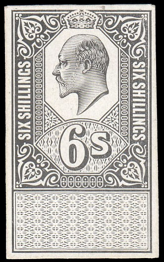 1902 6/- Unappropriated cut-down die proof in black on glazed card.