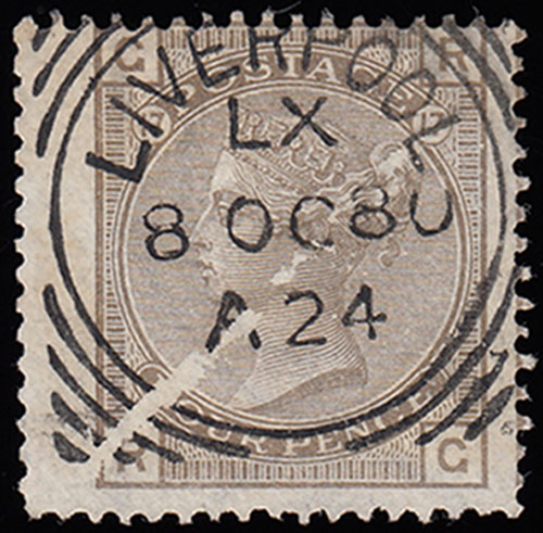 SG154 1880 4d. Grey-brown, plate 17 watermark large garter – partial dry print variety – foreign matter on plate when printing.