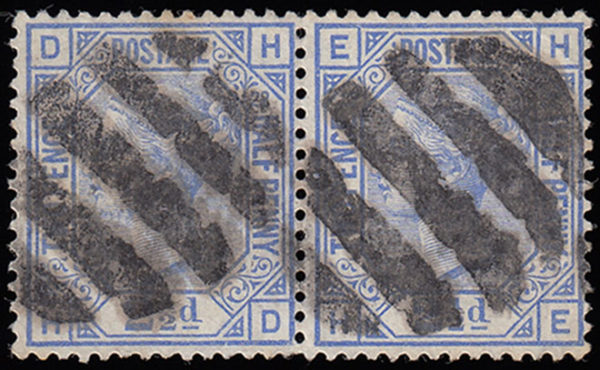 SG157 1881 2½d. Blue, plate 22, HD-HE. Fine used pair with “killer cancels” neatly struck. Unusual.