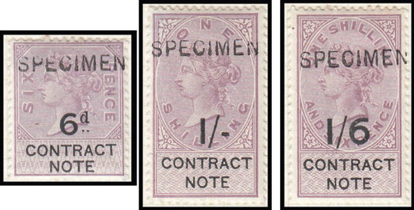 1888 Contract note, 6d., 1/- and 1/6d. values, overprinted SPECIMEN.