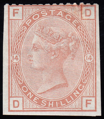 SG163 1881 1/- Orange-brown, plate 14 Imprimatur.