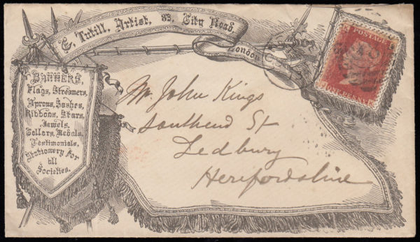 SG43 1873 1d. Rose-red, plate 168, JK on fine printed advertising envelope, London to Ledbury.