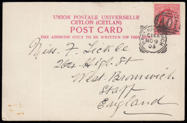 SG219 1903 Ceylon Picture Post Card, addressed to England.