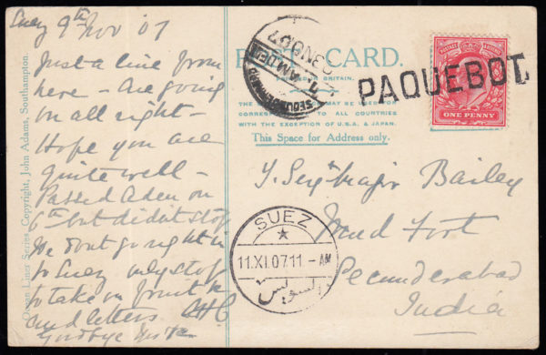 SG219 1907 1d. Scarlet on Picture Post Card to India with superb PAQUEBOT handstamp in black.