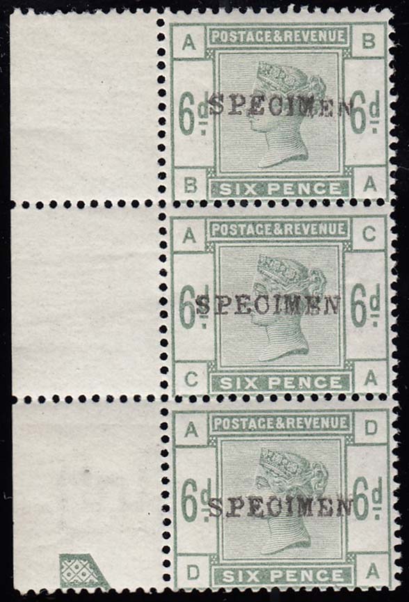 SG194 1884 6d. Dull green SPECIMEN type 9, a superb marginal strip of 3 with excellent colour.