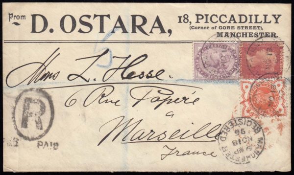 SG43, SG172 & SG197 “D. OSTARA” advertising envelope, registered from Manchester to Marseille, France.