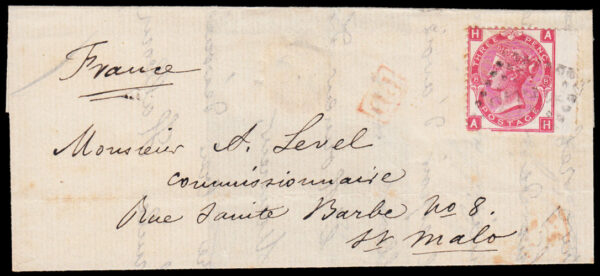 SG103 1868 3d. Rose Pl.5 (LB). Used on envelope addressed to BLOIS and solely cancelled by the “3734” ST MALO dotted lozenge with red transit alongside…