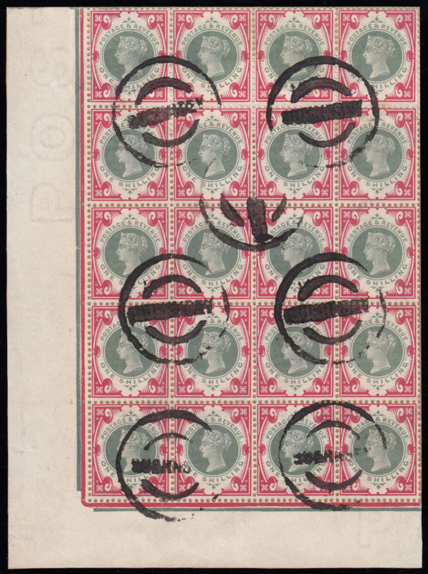 SG214 1900 1/- Green and carmine, very fine corner marginal block of 20.