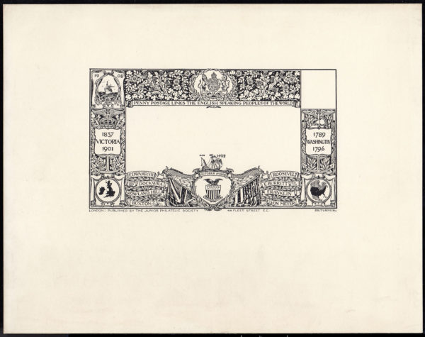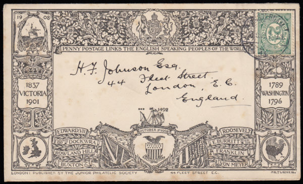 1908 Junior Philatelic Society Envelope, proof printed in black on thin, white glazed card.