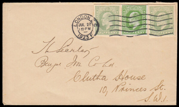 KEVII Stationery: Three stationery “cut-outs” used to pay the postage on envelope sent locally in LONDON.