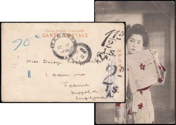 1908 Penang, Malaya to London post card, sent unpaid and charged Postage Due.