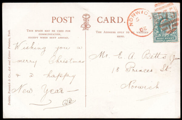 SG215 1903 ½d. Blue green on picture post card sent to London. Red “Posted in Advance for delivery on Christmas Day.