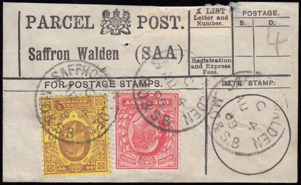 SG232c 1908 3d. Dull purple on orange yellow (chalky) on Parcel Post label of Saffron Walden.