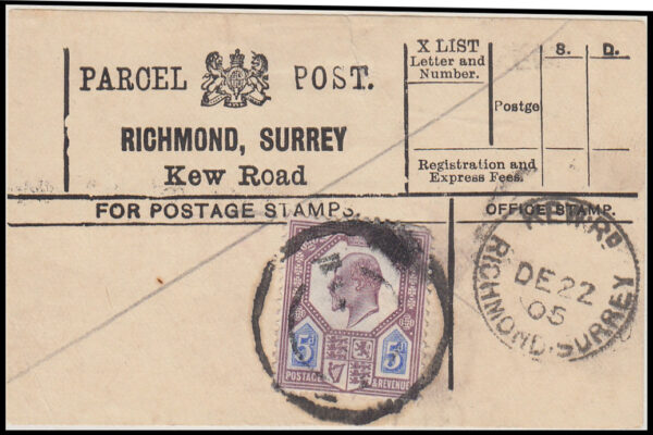 SG242 1905 Parcel Post Label from KEW ROAD with 5d. EDVII.