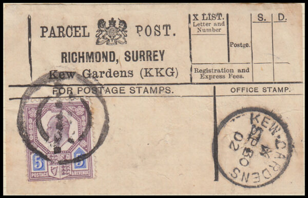 SG243 1902 5d. Edward VII on KEW GARDENS parcel post label.