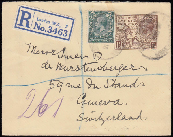 SG432 1925 1½d. Wembley stationery envelope uprated with 4d. and sent Registered.