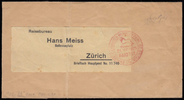 1925 Wembley red PAID 2½d. marking used on bulk mail, prepaid in cash.