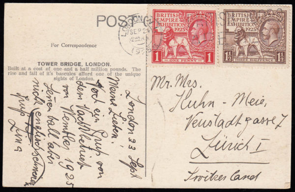SG432/ SG433 1925 Wembley set on post card of Tower Bridge to Zurich, Switzerland