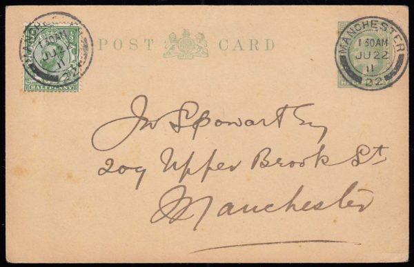 SG321 1911 Downey ½d. Post Card, uprated with ½d. to Germany, from Liverpool. Dated JU.22.11 – the first day of issue for both.