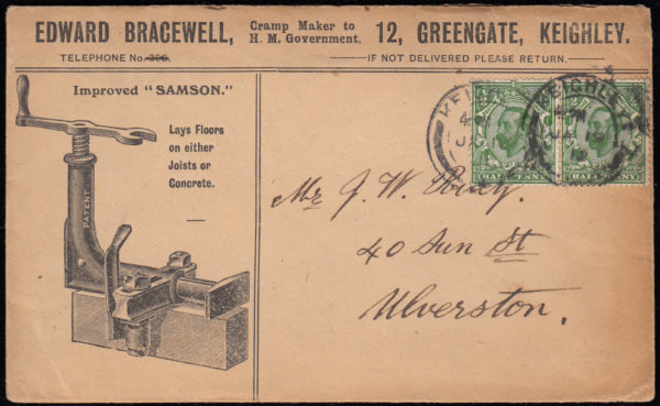SG322 1911 ½d. Green, Die 1A, wmk Crown pair on advertising envelope to Ulverston.