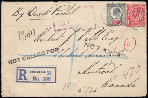 SG291 1912 Registered envelope, London to Canada “by Direct packet”.