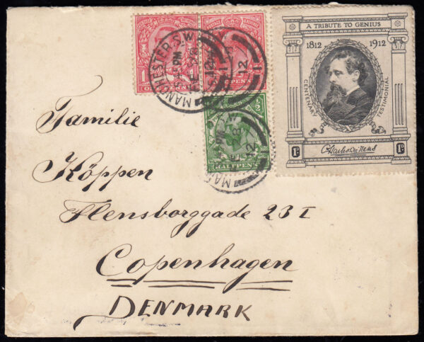 SG219 1912 Charles Dickens Centenary Testimonial 1d. label on cover, Manchester to Denmark.