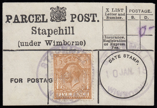 SG382 1918 5d. Yellow-brown on parcel post label of Stapehill (Dorset).