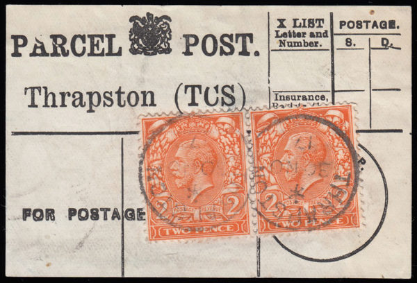 SG369var 1917 Parcel Post label, THRAPSTON.