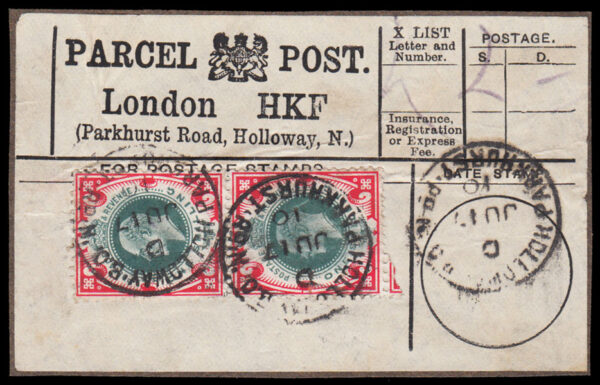 SG257a 1905 1s. Dull Green and Carmine (C). D.L.R. Parcel Post Label. Parkhurst Road, Holloway.
