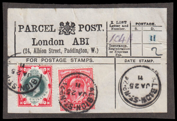 SG219 & 257a 1902 1d. Scarlet. D.L.R. and 1905 1s. Dull Green and Carmine (C). D.L.R. Parcel Post Label. 24 Albion Street, Paddington.