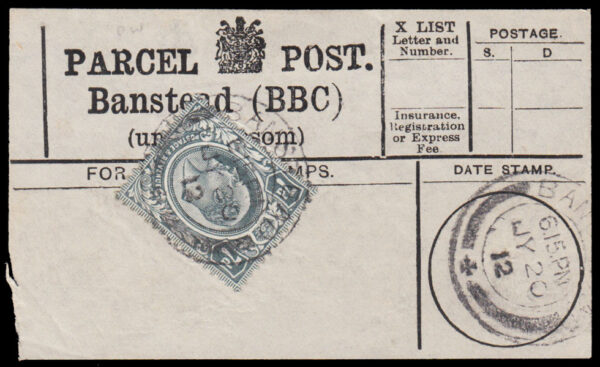 SG249 1910 7d Grey-black. D.L.R. Parcel Post Label. Banstead (Under Epsom). Neatly tied by c.d.s. for JY. 20. 12.