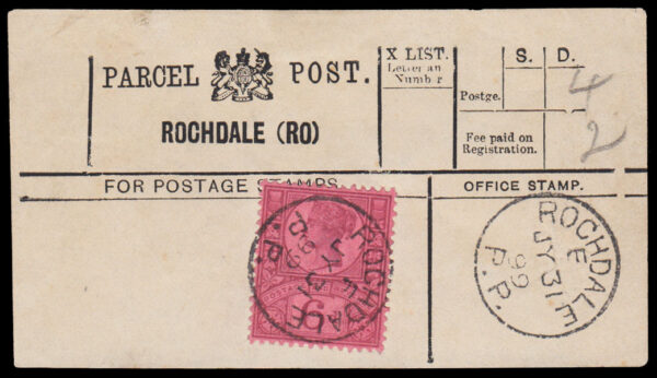 SG208 1887 6d. Purple on Rose-red “Jubilee”. Parcel Post Label. Rochdale.