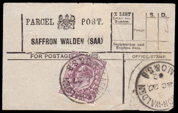 SG245 1902 6d. Pale Dull Purple. D.L.R. Parcel Post Label. Saffron Walden.