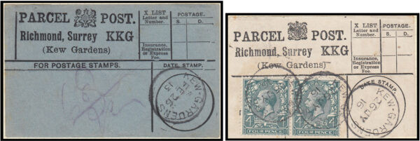 SG379 1913/ 16 Kew Gardens parcel labels, one in blue, the other with 2x 4d.’s.