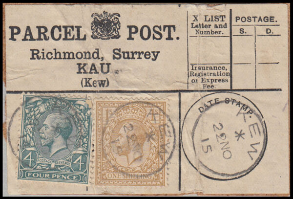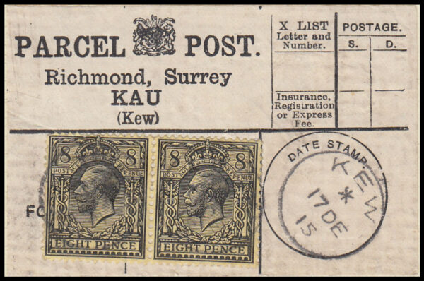 SG390 1915 8d. Royal Cypher on Kew Parcel Post label.