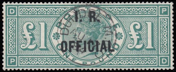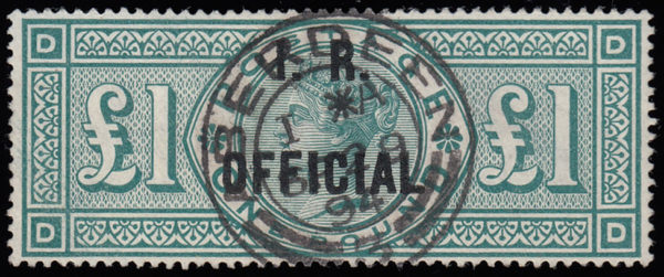 SGO15 1889 1/- Dull green IR Official. Superb used, neat PLYMOUTH cds.